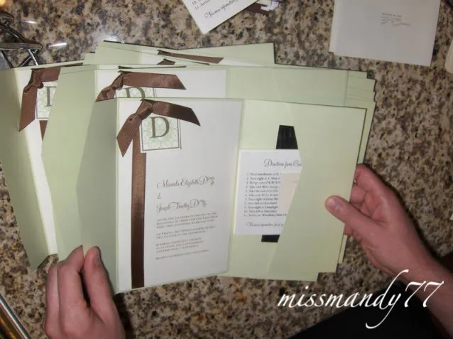 Joe and I put our blood, sweat (mainly, Joe's) and tears (mainly, mine) into these invitations. Joe was able to finally master his laser jet printer and the templates he created to get the entire set just right. Below are photos chronicling the entire process. If you're interested, I've also included the templates we created for our invitations. Hope the help you somehow. Fonts used were Feel Script and Garmmond in all caps and expanded - so the letters weren't so close together. We also went to Target and bought a really basic and plain invitation kit so we didn't have to cut and reformat the sizes of the invites and the RSVP cards. The size of the main invite was 8.5 x 5.5 and fit into a 6 x 9 sized pocket fold. Not to mention, this saved us a lot in paper buying!